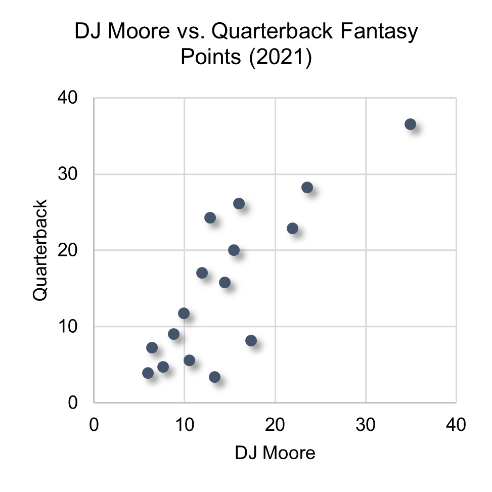Third, get creative. I’ve drawn up the quarterback–receiver stacking strategy within a quarterback-to-receiver framework. There are scenarios in which you can go the other direction. Consider DJ Moore circa 2021 and how he correlated with his quarterback(s).