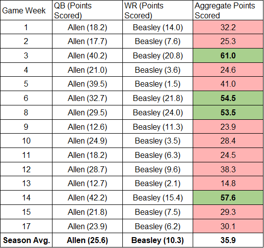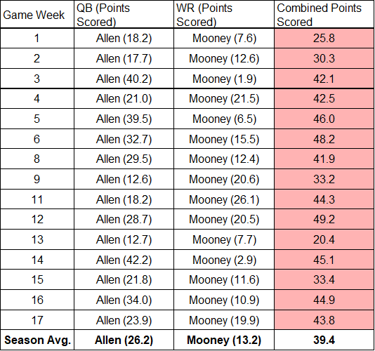 Let’s consider how pairing Allen with Mooney would have worked out in actuality. Below is a table of the combined points that an Allen–Mooney pairing would have produced in any given week in 2021: