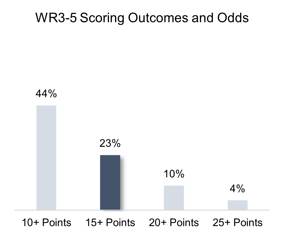 The chart below looks at historical WR3-5 scoring to infer odds of hitting upside outcomes. I use WR3-5s as this is likely the talent pool you’re pulling from to select your last flex players: