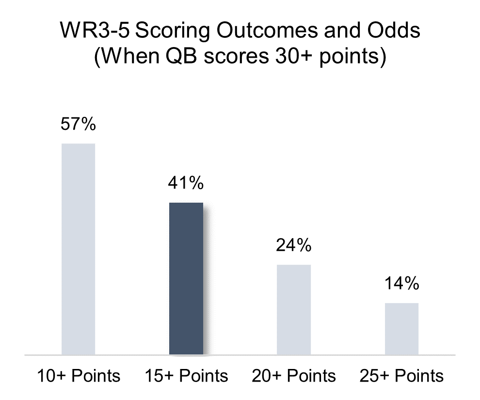 The next chart looks at historical WR3-5 performance, but this time, only at receivers whose quarterbacks scored 30+ points. We can interpret the results as indicative how one of Josh Allen’s receivers would perform if he too hit that 30 point mark. Unsurprisingly, the odds are much better: