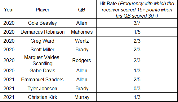 Note that some of the players listed above likely went undrafted in most leagues. My guess is that, Miller, Ward, and Johnson spent most of the seasons in question on waivers or free agency. Yet we can see that for Brady or Wentz (oofta) owners, there would have been many weeks in which picking up and starting one of them may have been a winning play. For participants in deep leagues with 3+ WR slots and 2+ flex, picking up a stackable receiver should always be a comeback consideration for that final flex spot.